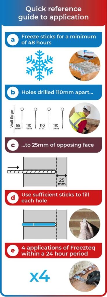 Following the Freezteq Original application, holes must be filled using an appropriate strength mortar to maintain the structural integrity of the wall. Independent technical advice should be sought with regards to the integrity of the structure.
