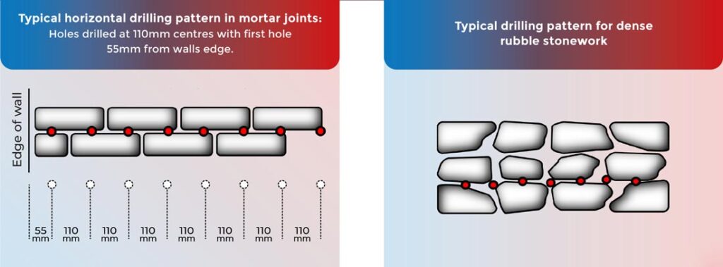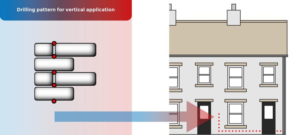 Additional holes should be drilled vertically to a height of 1.2m-1.5m following the mortar line. Once this has been completed, four applications of Freezteq Original are to be carried out as previously described.