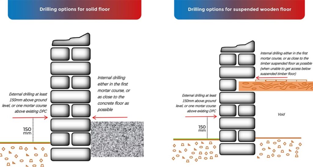 If the holes are to be made from the internal side, drill the holes as close as is possible to the floor’s surface, or in to the first horizontal joint above the internal floor’s surface (Note: assuming it is not possible to get access below the suspended timber floor).